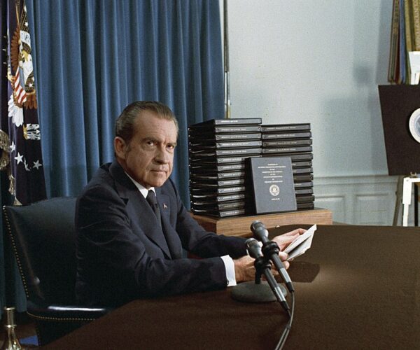 President Nixon with his edited transcripts of the White House Tapes subpoenaed by the Special Prosecutor, during his speech to the Nation on Watergate